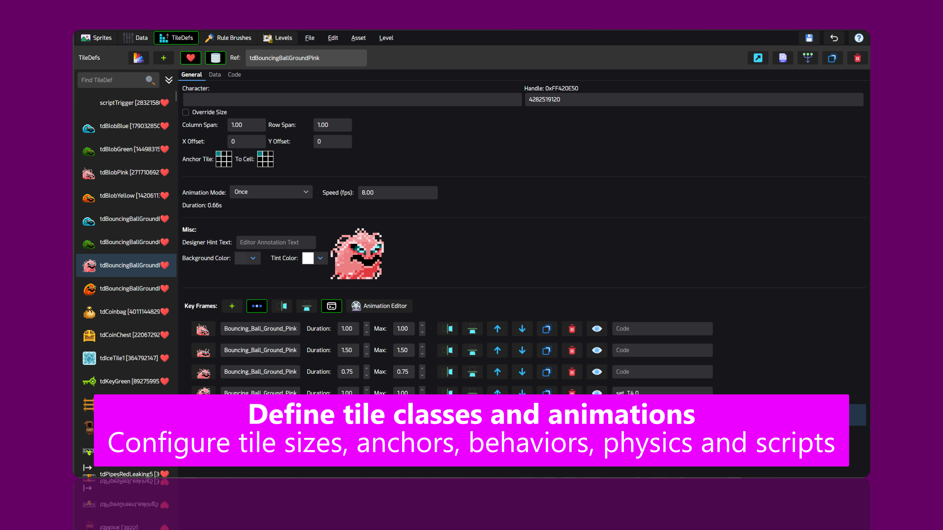 Set up tile definitions with various animation settings, background and tint colors and override their sizes and offsets on the grid. Additionally, you can assign variables and values to them and write custom scripts for tile definitions.