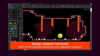 Create multiple boards per level and benefit from onion tools to draw on different layers with ease. Export levels as PNGs or ASCII-based scripts. Use Quads to add non-grid based 2D entities to your levels.