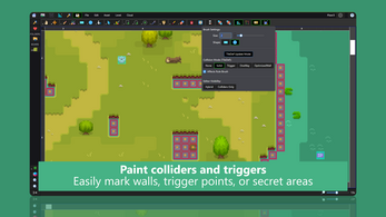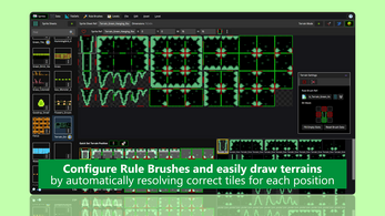 Set up rule-based brushes for terrains, platforms and other features by assigning rules to sprites, so the appropriate sprites are automatically chosen depending on their neighbors. Built-in support for bitmasking, 47-tiles and 4x4 tiles terrains. Draw or erase large areas with thick brushes, quickly creating levels.