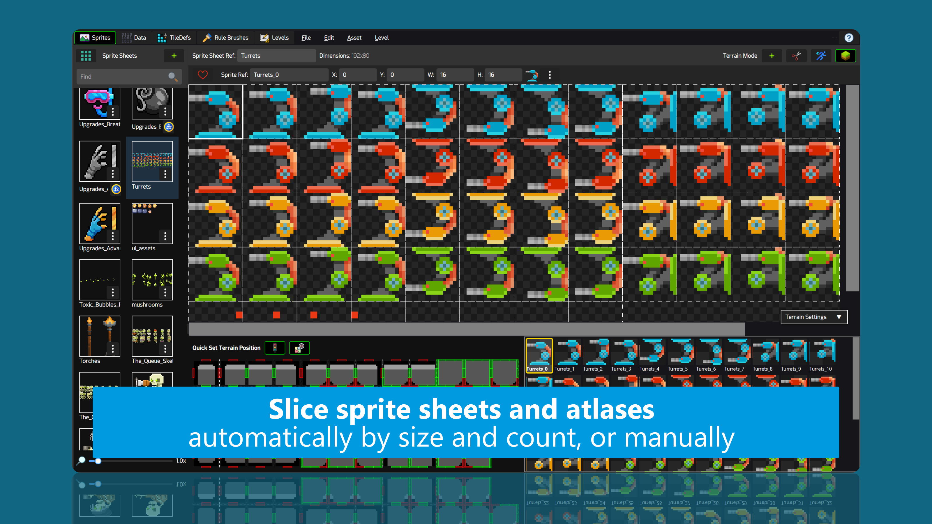 Import and slice your sprite sheets, remove opaque backgrounds by specifying a key color and set up tile bitmasks and brushes right within the sprite sheet editor and export them to rule brushes.